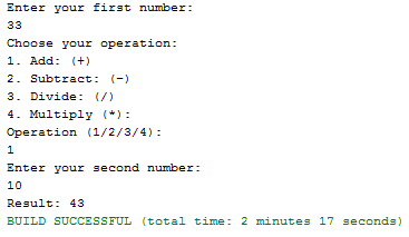 We first try the code - We create and object for our Scanner class, create variables to store our user input and then we proceed to ask the user to insert the numbers and operation for their calculation. To accept user input we user the Scanner class' nextLine method for strings and nextInt for integers. We then proceed to check which operation the user chose, by using the if statement. The if statement check to see if the operation method is equal to 1, if it is it proceeds to call the add method. As you can see we had to create an object for our calculator class for that our static main method can call our non static add method. Also we pass to values to the add method, these are the numbers the user enter previously. If operation is not 1 then it proceeds to the next else if. It checks to see if operation is equal 2 to if it is, it will exceute that code block, if not it moves on to the next else if. If the code has moved through all the else ifs and reaches the else block, it will then exceute what is in it, as all conditions before that was false. In our case the user will then be notified of their invalid choice. If no exceptions are caught during the execution of this block, the code will execute and then terminate as usual. However if the is an exception the catch block will be exceuted.